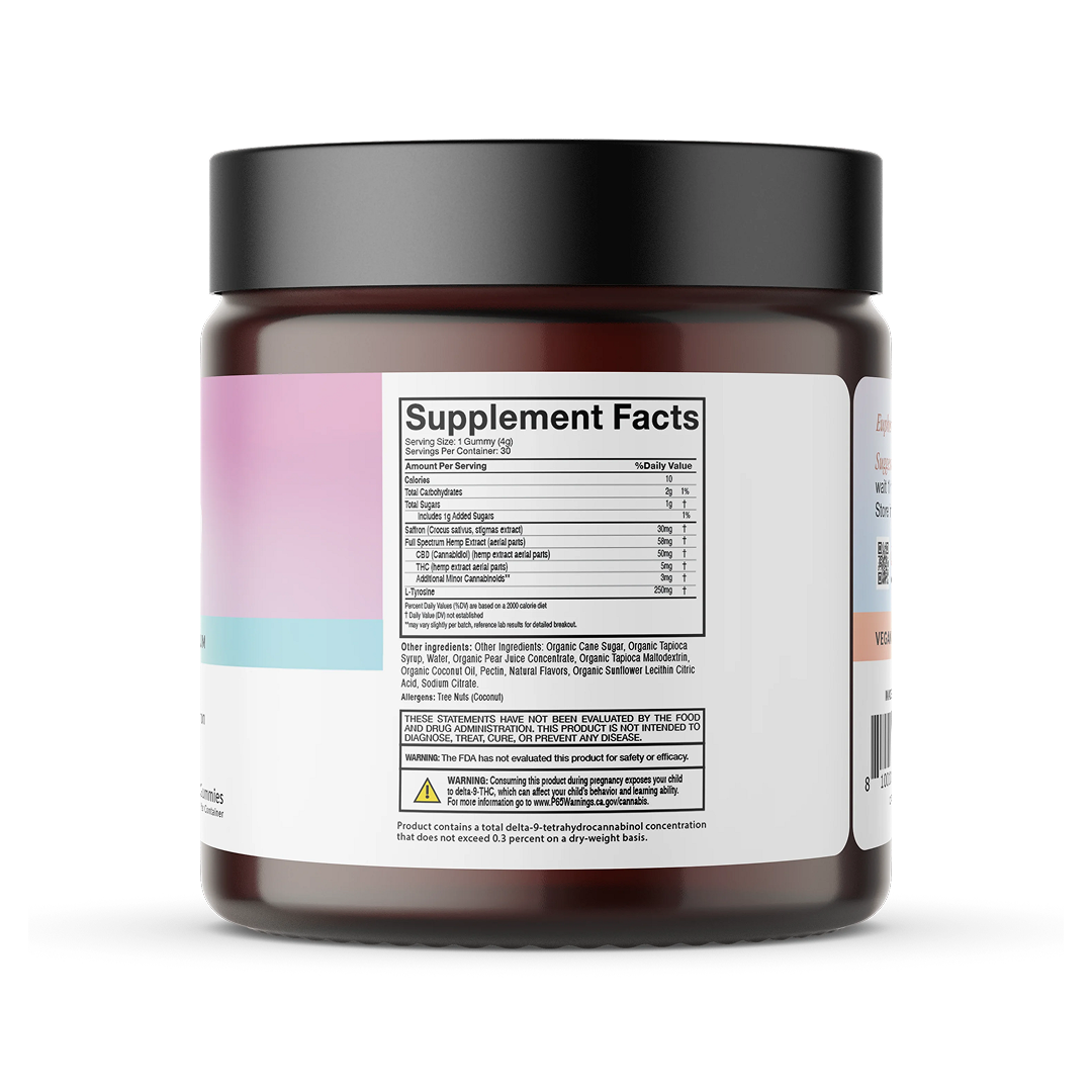 Supplement Facts label showing Calories 10; Total Carbs 3g; Total Sugars 2g; Saffron 30mg; Hemp extract 58mg (CBD 50mg; THC 5mg); L‑Tyrosine 250mg.
